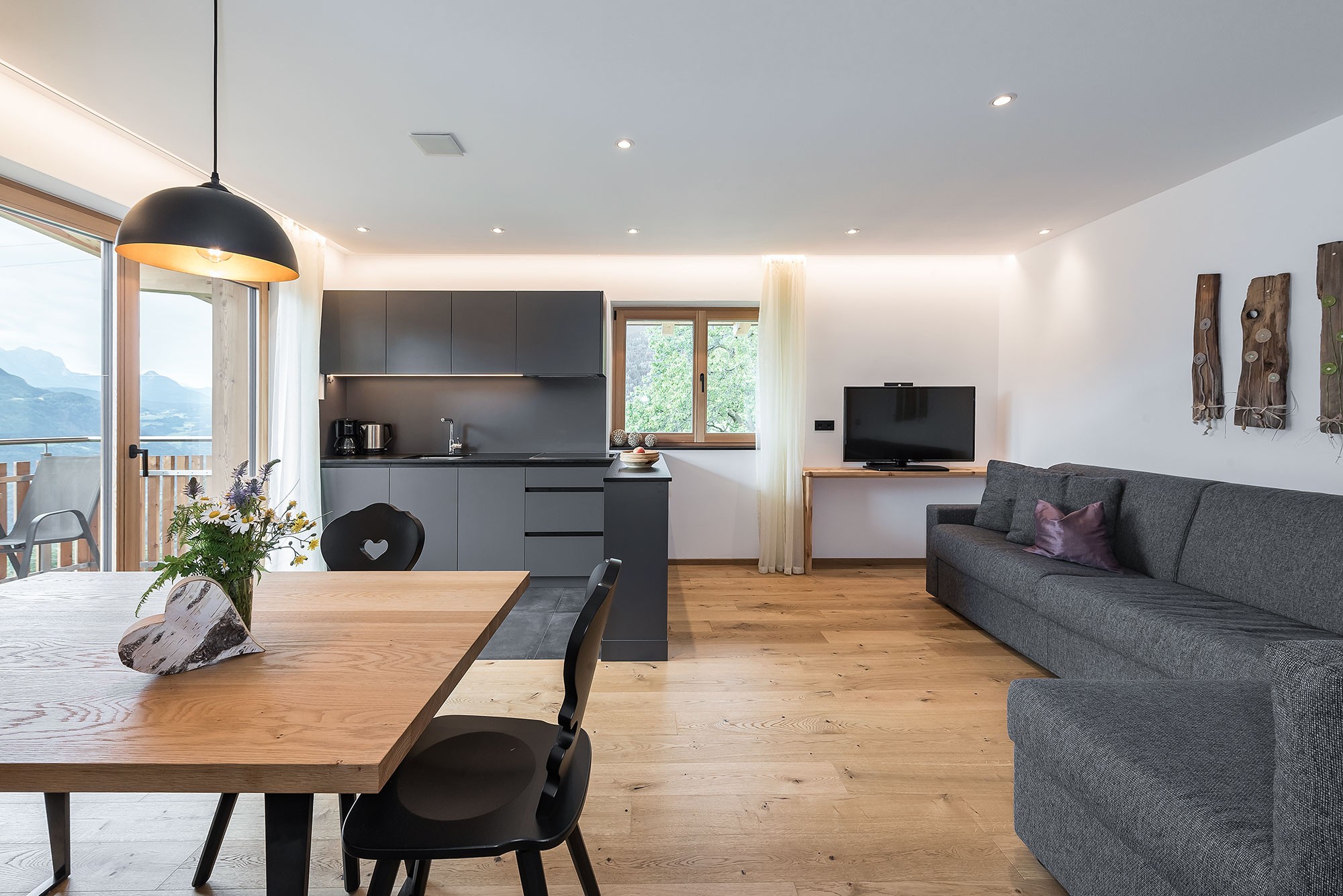 Im Haupthaus wohnen unsere Gäste in den charmanten Ferienwohnungen für 2–4 Personen, gebaut aus edlem Zirbenholz. Die Naturmaterialien sorgen für Ruhe und erholsamen Schlaf – und der Blick aus dem Fenster bringt die Berge direkt zu dir.
